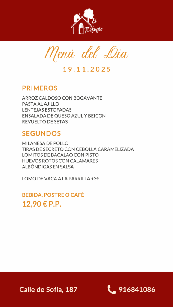 En Bar Restaurante El Refugio de Las Rosas, ubicado en el centro de Madrid, nos enorgullece ofrecer un menú diario que combina lo mejor de la cocina casera con opciones frescas y saludables. Nuestro menú está diseñado para satisfacer tanto a aquellos que buscan una comida rápida y deliciosa como a los que prefieren disfrutar de un almuerzo más relajado. Con ingredientes de calidad, preparamos cada plato con el mimo y la atención que nos caracteriza.